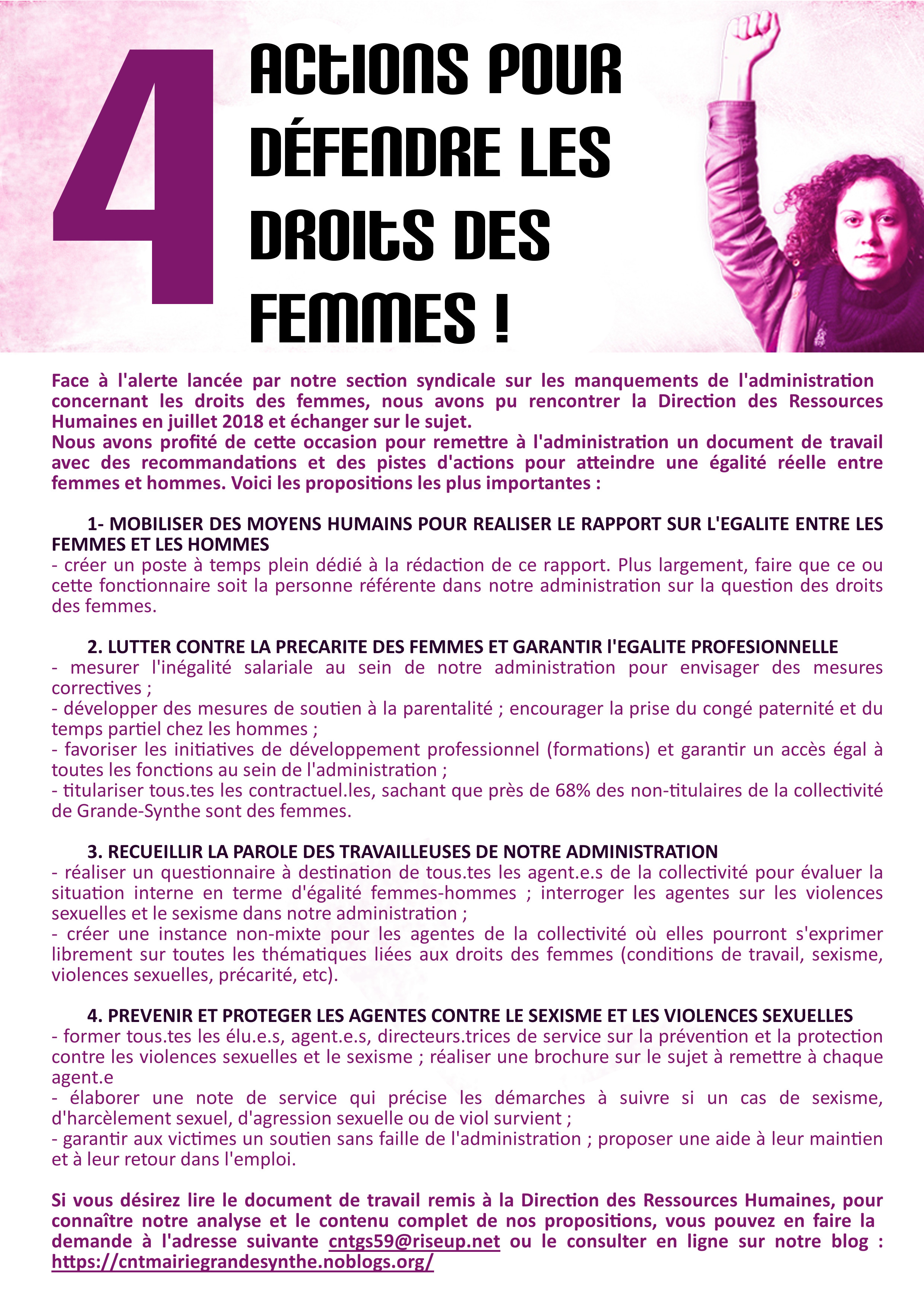Voici les recommandations et les pistes d’actions que nous avons remises à la DRH en juillet 2018 concernant la question de la politique interne d’égalité femmes hommes.